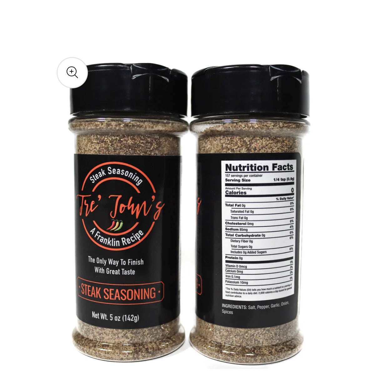 5.0 oz gluten-free steak seasoning. A combination of coarse salt flakes, pepper, onion powder, garlic powder and other spices.